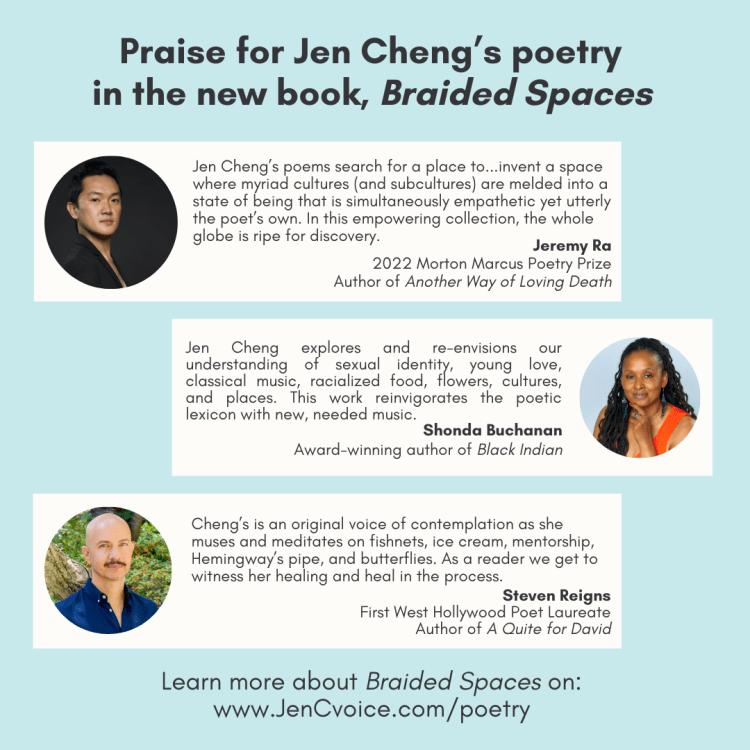 Jen Cheng is the West Hollywood Poet Laureate, a 2023 California Arts Council Fellow, author of Braided Spaces, and a multidisciplinary storyteller who amplifies under-represented voices. Jen is the founder of Palabras Literary Salon, celebrating BIPOC poets and writers. Jen blends East-West cultural influences in a new form, Feng Shui Poetry. With stories for tween audiences, mystery detective fans, and queer love, Jen is a cross-pollinator and community curator. Find her on Twitter/IG @JenCvoice or: http://www.JenCvoice.com