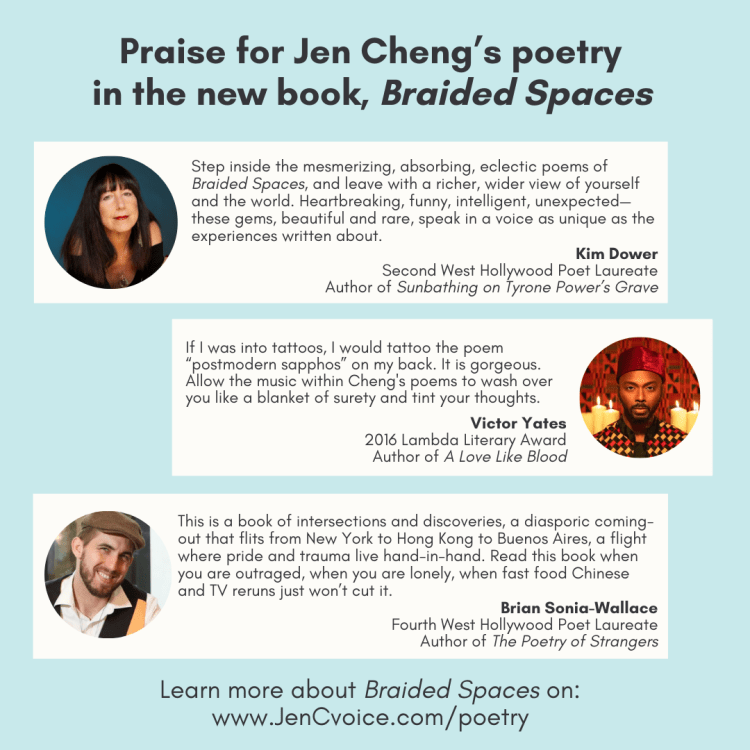 Poet Laureate for West Hollywood, Jen Cheng, published a new collection of poetry, Braided Spaces, (released October 24, 2023). With a vision for intersectionality where everyone’s aspects are celebrated, she weaves stories into poetry to make you feel welcome.